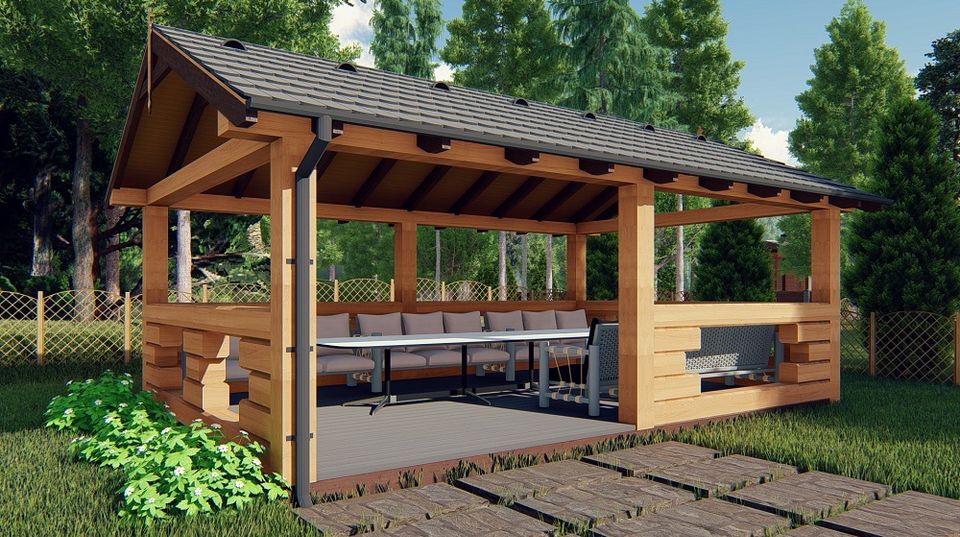 Простора альтанка, відмінно підійде для заміського будиночка або дачної ділянки, а також її можна розташувати на березі річки або озера.