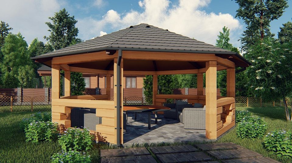 The wooden octagonal arbor from a glued beam can be established on a country site or used as a place of rest near the river, lake. Only environmentally friendly materials are used in its manufacture.