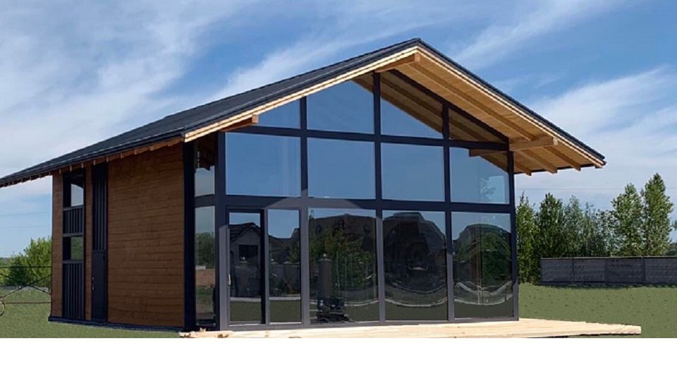 Half-timbered house project made of glued beams. Light construction, large panoramic windows. The house seems to hover in the air above the ground. Such a project is both practical and reliable. Implemented in the shortest possible time and lasts for many years. Simplicity and functionality is his motto!