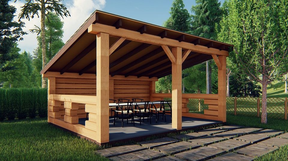 Деревянная прямоугольная беседка из бруса пользуется повышенной популярностью после квадратной. Она позволит установить при желании мангал и вмещать в себя много отдыхающих.